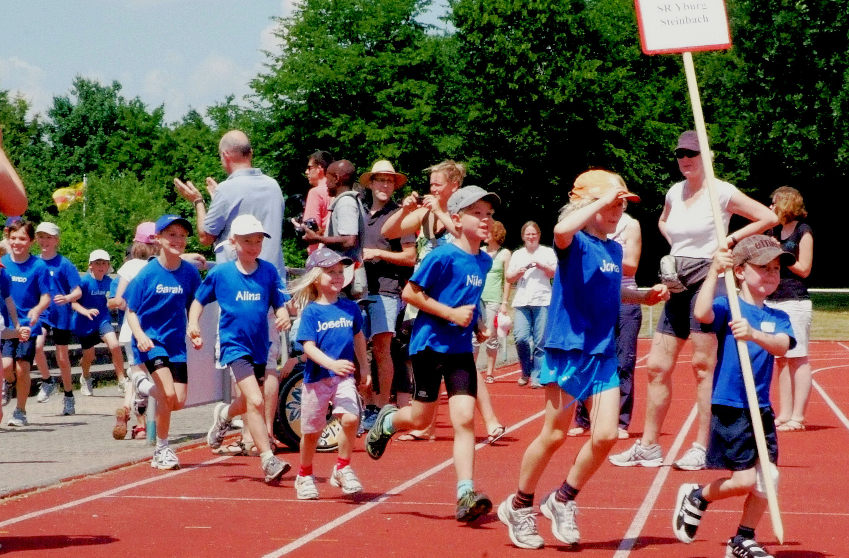 Schon als der kleine Tom Späth die Tafel mit der Aufschrift SR Yburg ins Stadion trug und die ganze Mannschaft im Laufschritt hinterher, war klar, dass unsere Mädels und Jungs an diesem Spaß haben würden. Das allein schon deshalb, weil der äußere Rahmen ein bisschen wie Olympia ist: Einmarsch, Aufstellung ein von einer Schülerin vorgetragenes Fairness-Versprechen und natürlich die aufsteigenden Brieftauben.