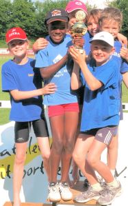 Für die Hindernisstaffel gab es eine eigene Pokalwertung. Im letzten Jahr knapp verpasst, waren die Mädels und Jungs dieses Mal so schnell, dass sie sogar den Gummiring, der den Staffelstab ersetzte, fallen lassen konnten um trotzdem mit der schnellsten Zeit ins Ziel zu kommen. Hier waren wir sogar mit drei Teams am Start, selbst die sechs und siebenjähren bewältigten die 50 Zentimeter hohen Hindernisse mühelos.