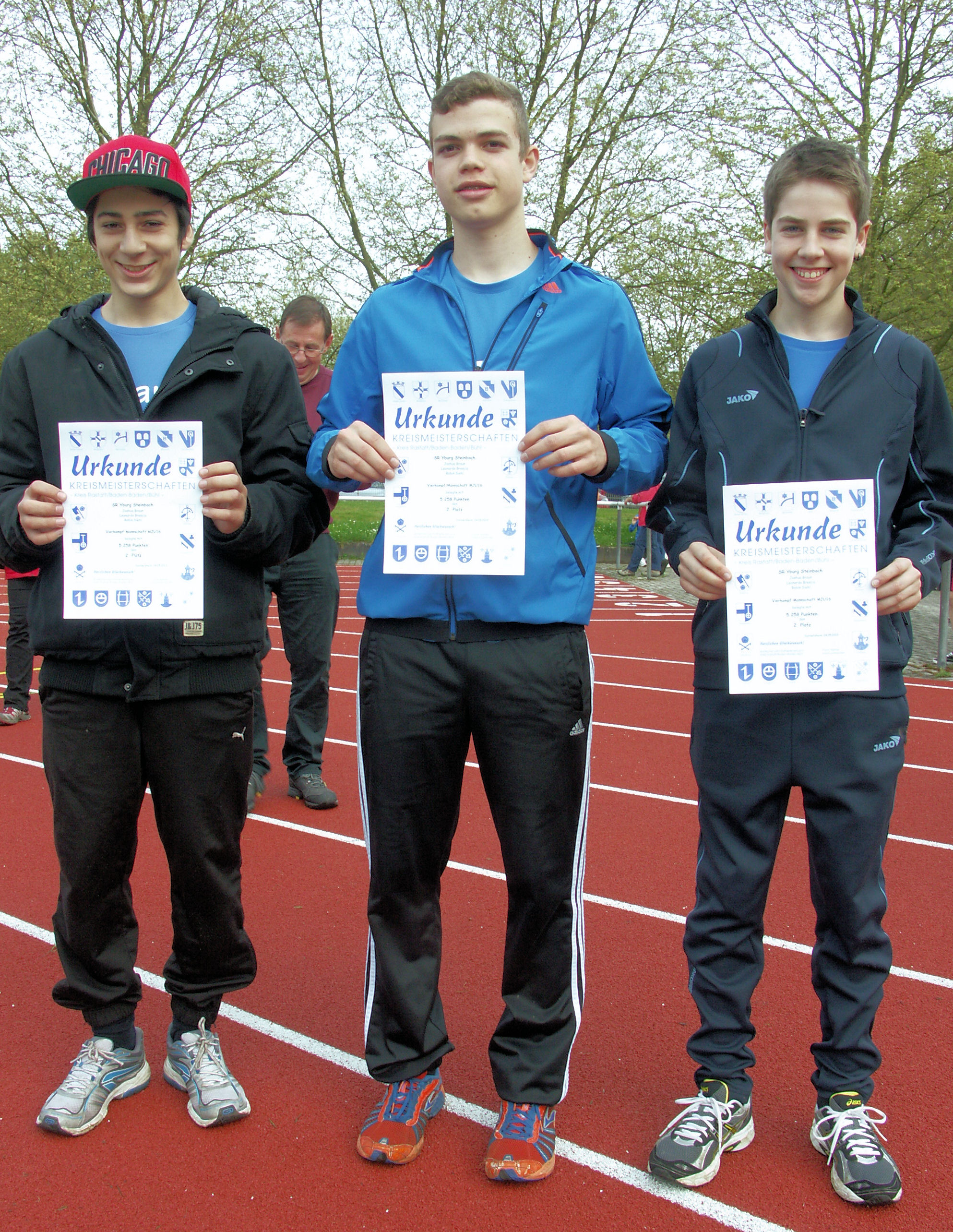 Bei den Jungs M14 gab es einen Doppelsieg für den SR Yburg. Wie erwartet konnte Joshua Braun den Vierkampf-Titel mit nach Hause nehmen, Vizemeister wurde Leonardo Brescia. In der Klasse M15 verfehlte Robin Siehl hauchdünn den dritten Rang. Alle drei zeigten starke Sprintleistungen, wobei sie das Kunststück fertig brachten fast exakt dieselbe Zeit zu laufen. Leonardo und Robin kamen auf 12,72 Sekunden über die 100 Meter Distanz. Joshua braucht 6/100 Sekunden länger. Ein gelungener Einstand in die Saison. Im Weitsprung blieben alle drei etwas unter ihren Möglichkeiten, die Marke von 4,50 Meter konnte nicht übertroffen werden. Im Hochsprung verfehlte Joshua Braun mit 1,45 Meter seine Bestleistung nur um einen Zentimeter, aber da ist sicher noch mehr möglich. Genauso wie bei Robin Siehl im Kugelstoßen, der zwar mit 10,21 Metern eine neue Bestleistung erzielte, aber sicher deutlich mehr kann. Zusammen kamen die drei als Mannschaft auf Platz zwei.