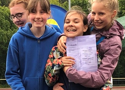 Dem standen die gleichaltrigen Mädels in nichts nach. Auch sie holten die Staffelmeisterschaft mit klarem Vorsprung und liefen in der Besetzung Svenja Habicht, Josefine Fruchtmann, Anna Hohmann und Sarah Roth zum Titel. Keinen Einzelsieg, dafür aber zwei Vizemeisterschaften mit tollen Leistungen errang Anna Hohmann. Sie kam über 75 Meter nach 10,89 Sekunden und nur 1/100 Sekunde (!) hinter der Siegerin ins Ziel. Auch im Weitsprung landete sie mit starken 4,45 Metern auf dem Silberrang. Kreismeisterin wurde Hana Kukic, bei der sich das Hochsprungtraining der letzten Wochen voll ausgezahlt hat. Sie überquerte 1,33 Meter und lag damit klar vor der Konkurrenz. Fünfte mit dem Speerwurde Svenja Habicht, die sich auch für das B-Finale über 75 Meter qualifizieren konnte (11,74s), genauso wie Line Hünerfeld (11,75s). Bei den W13 Mädels war Sarah Roth schnellste Sprinterin. Sie gewann den Titel über 75 Meter in exakt 11 Sekunden. Einen kompletten Medaillensatz brachte Josefine Fruchtmann mit nach Hause. Sie siegte im Speerwurf mit guten 27,26 Metern, wurde Zweite mit dem Diskus (22,22m) und Dritte im Hochsprung (1,30m).
