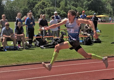 Jetzt war er endlich da, der Sprung über die 14 Meter Marke. Mit 14,11 im dritten Durchgang und noch einmal 14,04 im vierten Versuch flog er gleich zweimal weiter als je zuvor. Damit siegte er gegen die starke nationale Konkurrenz und liegt damit in Deutschland auf Platz der aktuellen U18 Bestenliste. Zwei knapp ungültige Sprünge deuteten an, dass das noch nicht sein letztes Wort sein muss.