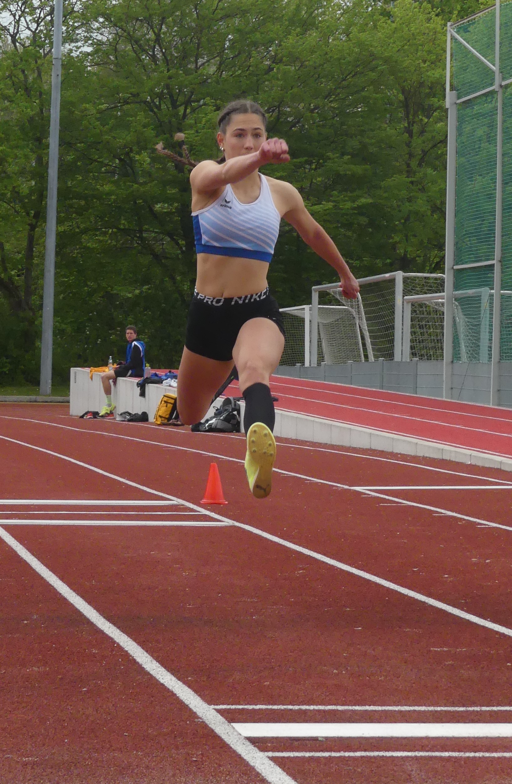 Dieses Mal stand der Dreisprung auf dem Programm und wieder gab es direkt zwei neue persönliche Bestleistungen und sehenswerte Sprünge. Allen voran Rachel Fruchtmann, die mit vier Sprüngen über zwölf Meter eine starke Serie und schon eine erstaunliche Konstanz zeigte. Nach zunächst zwei Fehlversuchen folgte mit 12,27 Metern gleich eine neue Bestmarke, die sie in ihrem letzten Sprung noch einmal um einen Zentimeter steigern konnte. Nachdem in der letzten Saison wegen einer Verletzung und Corona für sie gar nichts ging, war das ein mehr als ermutigendes Comeback in ihrer Lieblingsdisziplin. Ganz nebenbei war das auch ein neuer U20 Kreisrekord. Die zweite Bestmarke konnte U18 Springerin Karla Rathmer für sich verzeichnen. Nachdem sie fünf Mal mit ordentlichen weiten bis 10,90 Meter Anlauf genommen hatte, gelang ihr im sechsten Versuch der erste Sprung über die 11 Meter Marke. Und so wie der aussah sollten die 11.09 Meter nicht ihr letzte Wort gewesen sein.