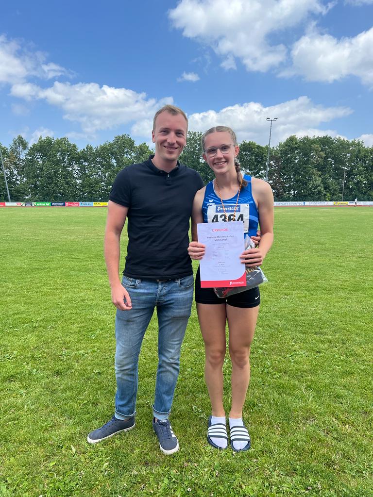Am Wochenende standen die Badischen Mehrkampfmeisterschaften in Langensteinbach im Wettkampfkalender. In der Altersklasse W14 gewann Leni Falk vom SR Yburg Steinbach souverän den Titel im Siebenkampf der Mädchen. Leni legte an Tag 1 einen fulinaten Start in den Wettkampf hin und gewann den 100 m Lauf in 12,83 sec. Im Hochsprung wurde sie mit übersprungenen 1,44 m Dritte. Es folgte mit 4,87 m im Weitsprung die dritte persönlichen Bestleistung an diesem Tag. Auch im abschließenden Kugelstoßwettkampf verbesserte Leni Ihre Bestweite noch einmal um ein paar Zentimeter und stieß die Kugel bis zur Marke von 9,70 m. Auch in dieser Disziplin ließ die junge Steinbacherin alle Konkurrentinnen hinter sich und lag damit am Ende des ersten Tages bereits auf Platz 1. An Tag 2 folgten Hürdenlauf, Speerwurf und der abschließende 800 m Lauf. Über die Hürden und im Speerwurf blieb Leni etwas hinter den Erwartungen zurück. Ihr Siegeswille und ihr Kampfgeist beflügelten Sie in den letzten beiden Stadionrunden und Leni kam nach 2:47,35 als Zweite ins Ziel. Trainer Michi Beck war mehr als zufrieden mit seiner Athletin. „Leni ist als Favoritin nach Langensteinbach angereist. In einem Siebenkampf kann jedoch so viel passieren. Daher bin ich jetzt froh und stolz, dass Leni den Titel so überzeugend eingetütet hat.“ Am Ende wurde die 14jährige Schülerin mit 3.388 Punkten Badische Mehrkampfmeisterin. Die Deutschen Meisterschaften können kommen.