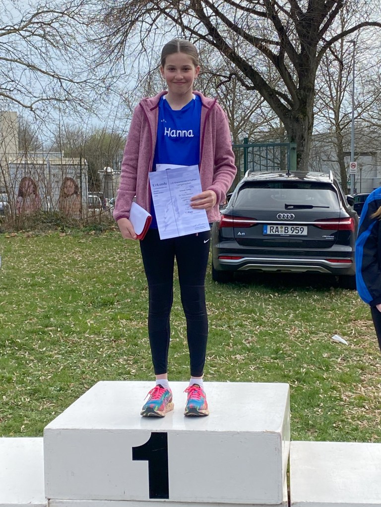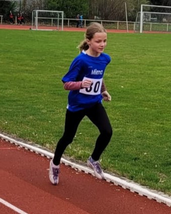 Die W12 und 13 Mädchen starteten gemeinsam über die 2000 Meter wurden aber am Ende getrennt gewertet. Wie schon bei der Waldlaufmeisterschaft vor zwei Wochen lief Hanna Erhardt bei ihrem ersten Rennen auf dieser Strecke mutig in der Spitzengruppe mit. Nach einem recht geleichmäßigen Tempo während der ersten vier Runden ging es dann auf den letzten 400 Meter zur Sache und Hanna musste am Ende nochmal alles geben um als Siegerin der W12 nach 7:59,37 Minuten über die Ziellinie zu laufen.