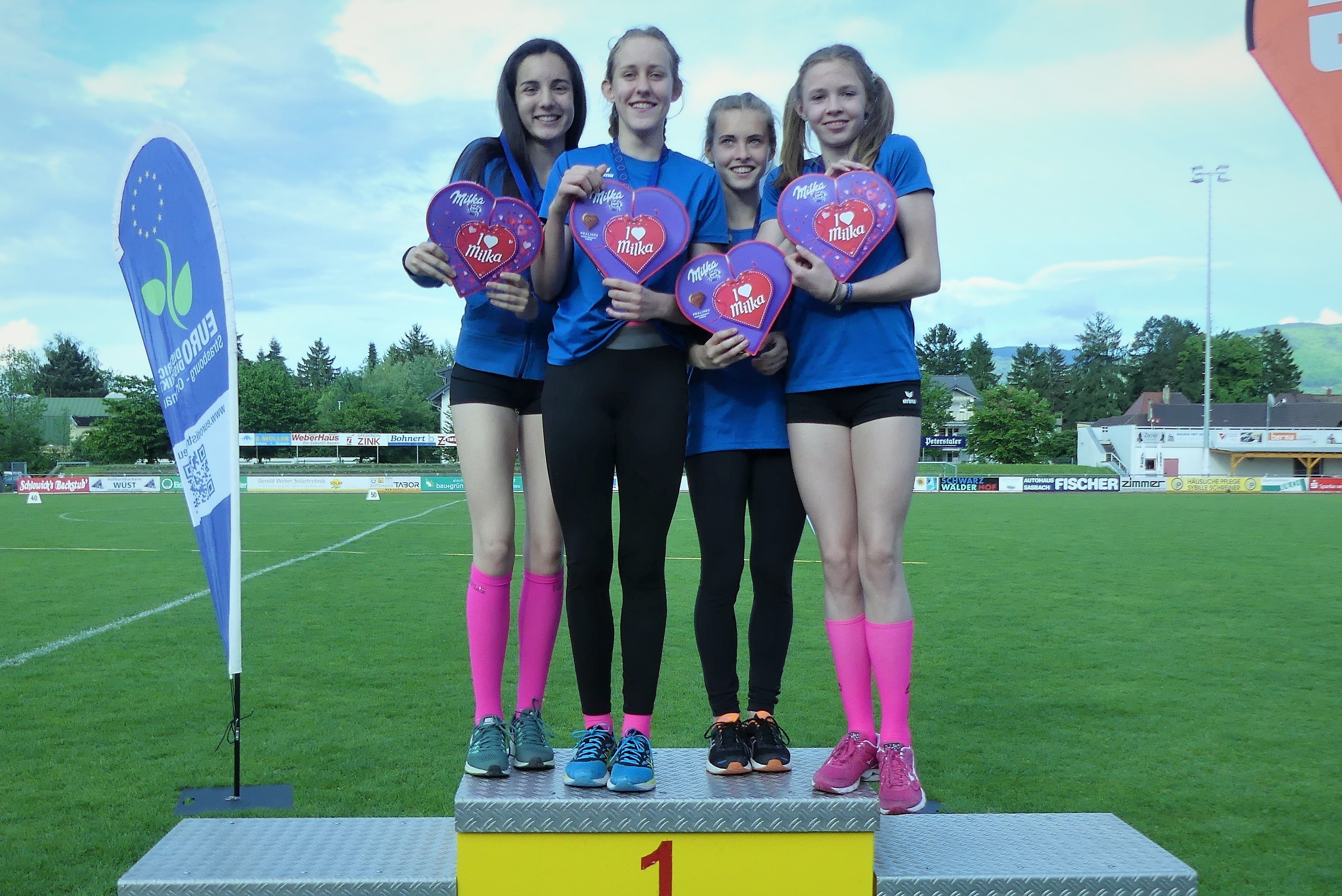 Vorheriges Bild Nächstes Bild Staffel Mit 50,82 Sekunden an der Spitze der badischen Bestenliste über 4×100 Meter: Gloria, Hanna,Celine und Helen